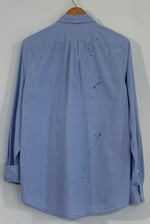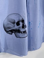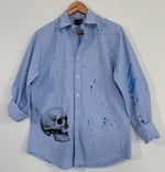Gap Classic Fit button-down shirt, rescued from becoming another discarded garment. Transformed with blue ink splatter detailing plus a hand-pulled skull screenprint. Put a skull on it!